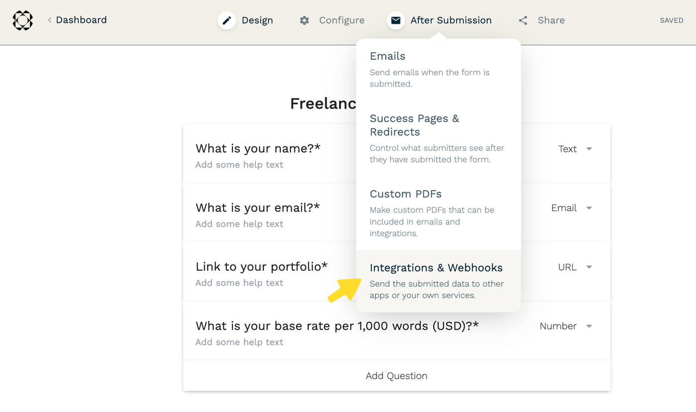 First up, I suggest only setting up this integration once you've got the basics of your form complete. You don't need to have settled on the design, but having your questions set will make things easier down the line. So once that's done, head to After Submissions, and select Integrations & Webhooks from the menu.