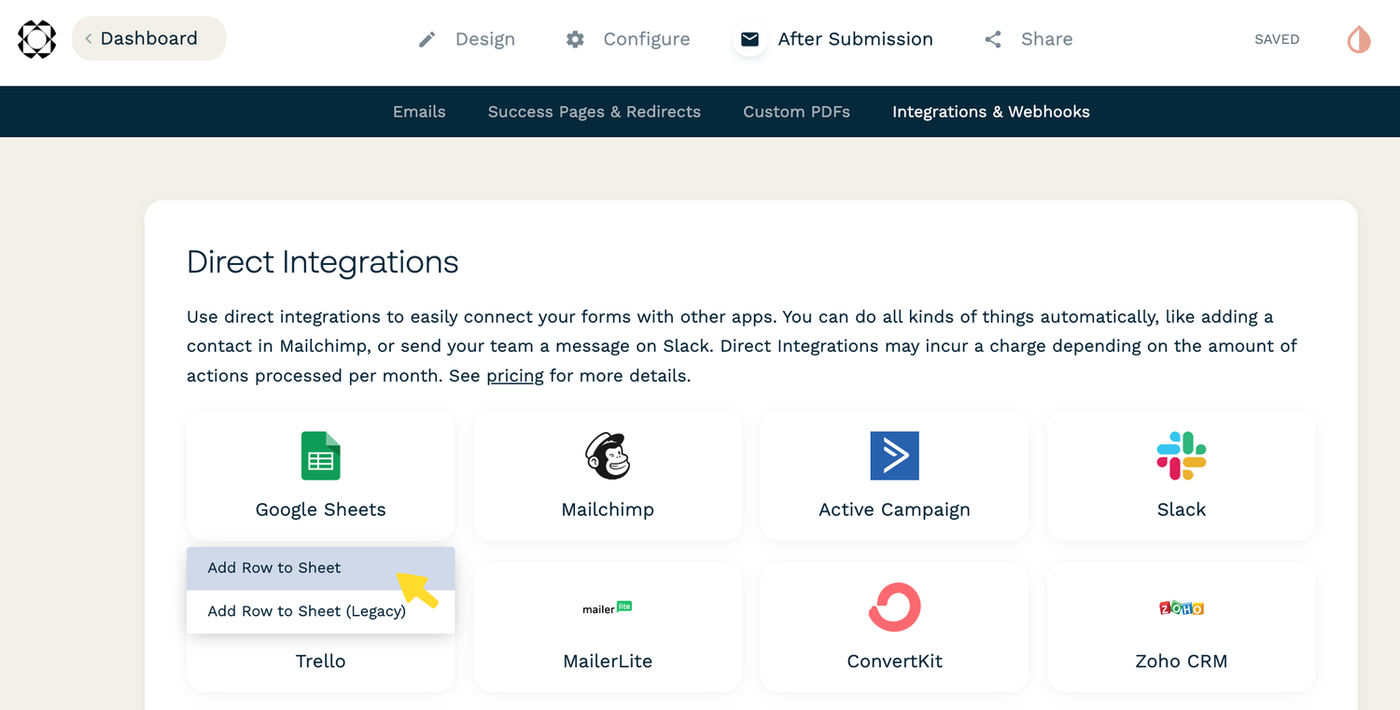 Google Sheets is the first app listed in the direct integrations library, so you won't be able to miss it. Click the tile and select Add row to Sheet. As the name suggests, this makes it so every form submission fills a row of your spreadsheet.