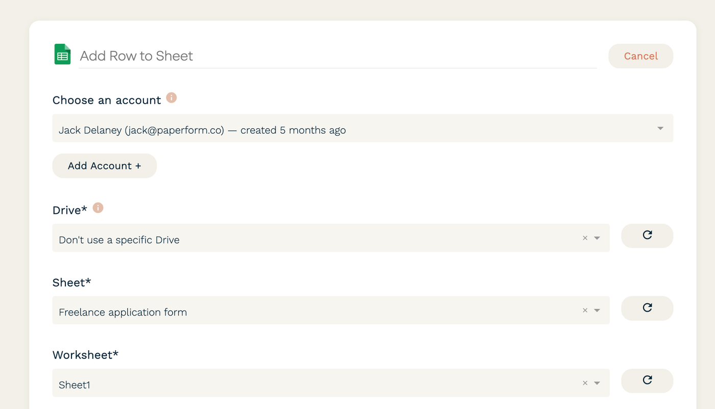 This directs you to the Google Sheets integration setup. Add your Google account and select the Drive your Sheet is stored in. When that's done you can choose the spreadsheet you want to map responses to. If you don't have a Sheet ready to go, jump to docs.google.com/spreadsheets/ and create one. Hit the refresh button and it'll appear in the list.