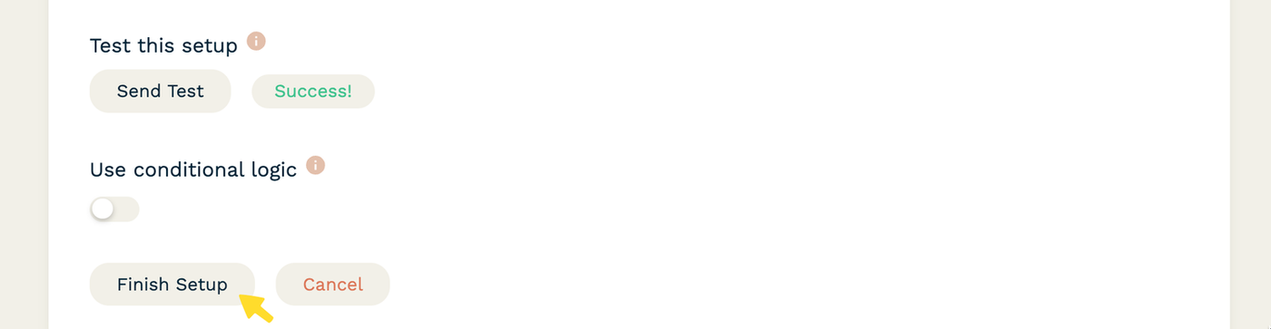 Once you've mapped each question, click Send Test. If people have submitted this form before, the test will run with the last submission, but if it's a brand new form, you'll have to put through a dummy submission first. If you've followed this guide, a lovely green Success! message will appear. All that's left to do is hit Finish Setup.