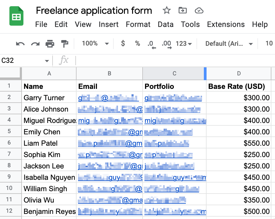 For this tutorial, I've connected Google Sheets with the form I use for freelance writer applications (something I should've done ages ago!), which asks for the writer's name, email, portfolio and base rate. Now any time someone submits the form, the data is neatly sorted in Google Sheets—without me lifting a finger.