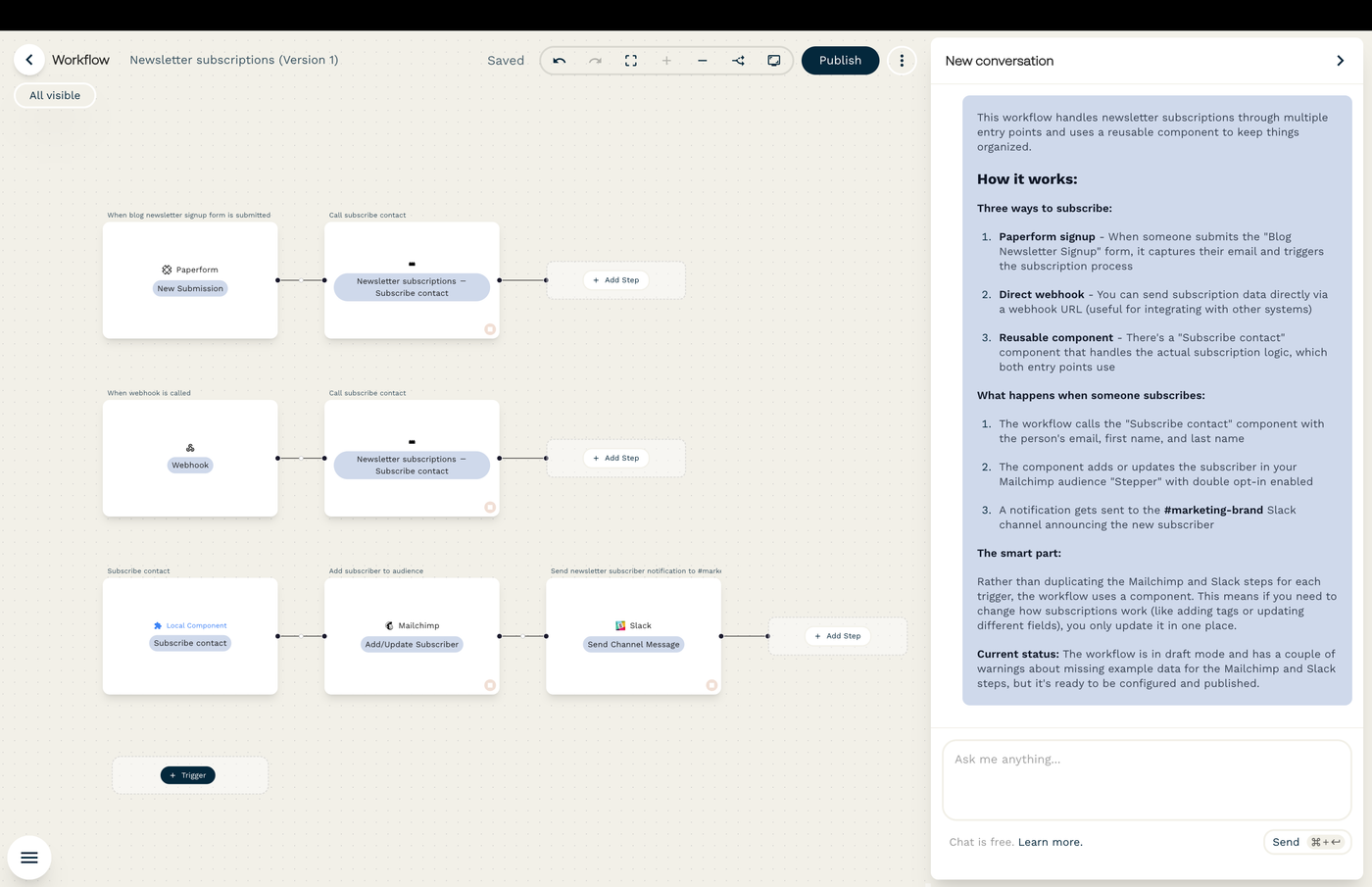 One of the key stand-out features of Stepper is Components. These are reusable modular building blocks you can create once and reuse everywhere. Users can build up their Component library and then drop those Components into as many flows as they want. This also includes support for multiple triggers in the same workflow. This allows users to build related automations together in one place. It also unlocks powerful applications for recurring logic like authentication, approvals, client handoffs, lookups, and common transforms.
