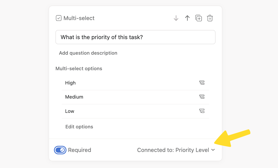 For example, for our design requests, we mapped each field so that when someone submits a form, the tasks automatically added and updated without any additional manual busywork. To link to a field, click on a question and select Connect to field. All that's left to do is pick a field, or even create a new one.
