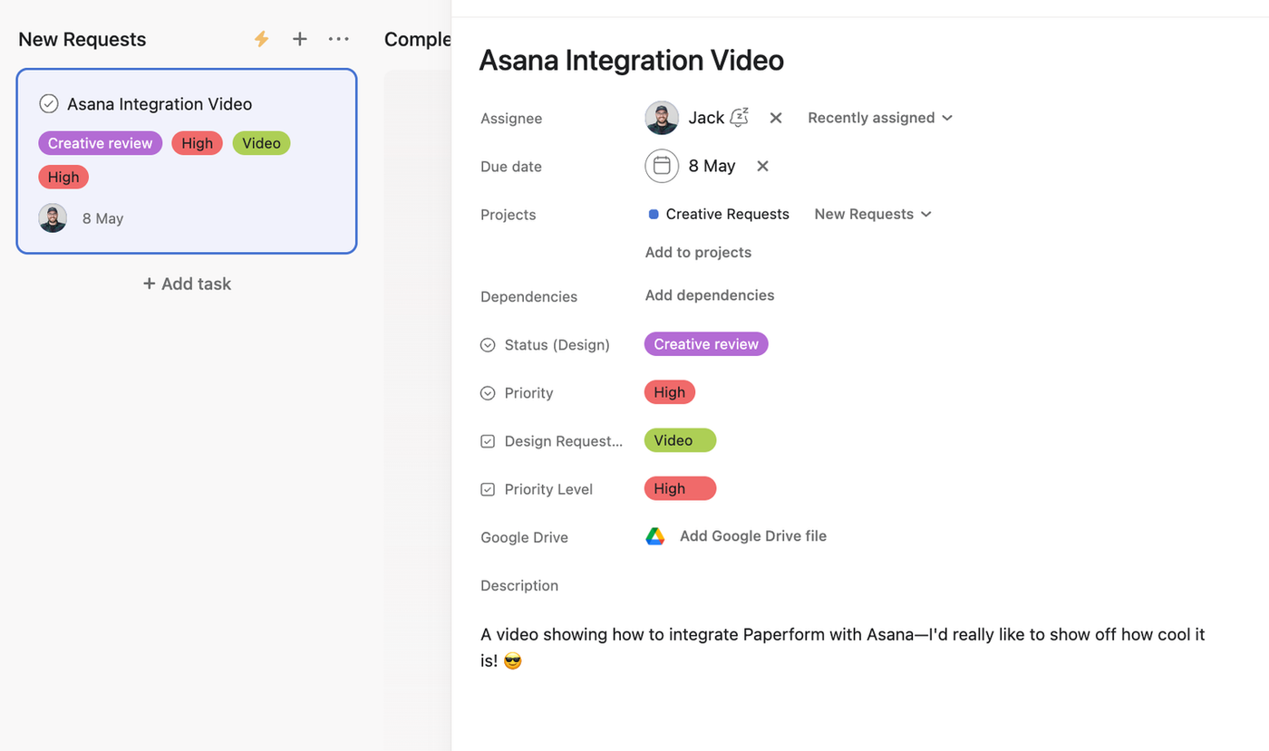 An example of a Video Request Form made with Paperform (Paperform)  An example of Paperform's Asana integration at work—this task has been created from the Video Request Form above upon submission (Source: Asana)