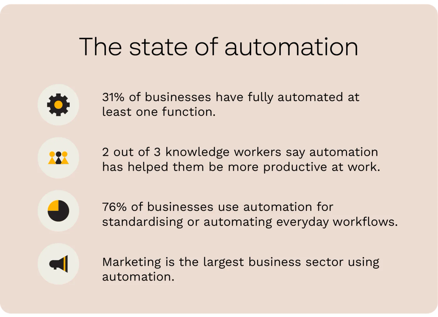 - 76% of businesses use automation for standardising or automating daily workflows; 58% use automation for data/reporting for planning, and 36% use it for regulation or compliance (Formstack).