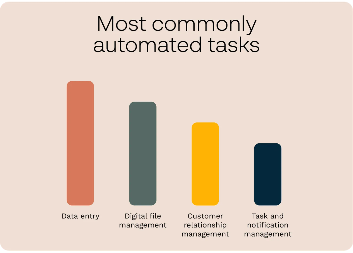 - The most commonly automated tasks include: data entry (38%), document creation and organisation (32%), lead management (30%), and inventory management (27%) (Zapier).