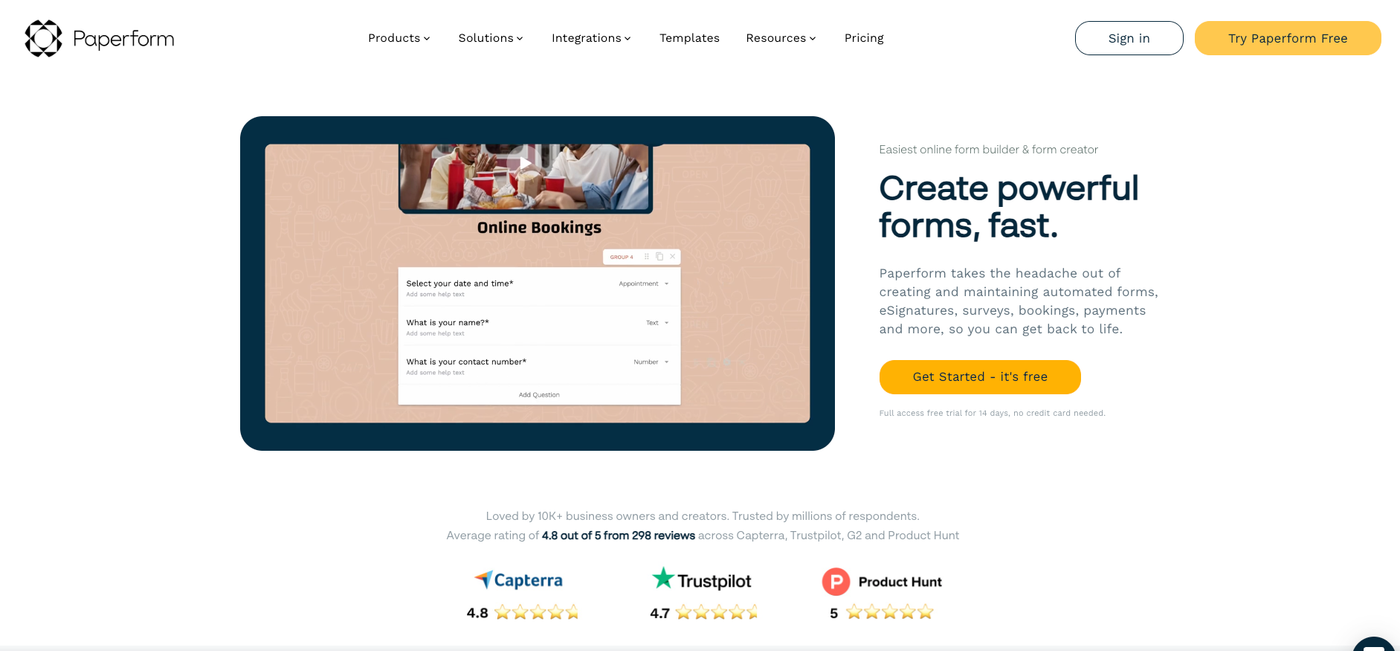 Why not get started with Paperform’s 14-day free trial? You can use our one-of-a-kind builder to make beautiful surveys, and forms, that reflect your brand, collect payments, take bookings, and easily integrate with your favourite apps.