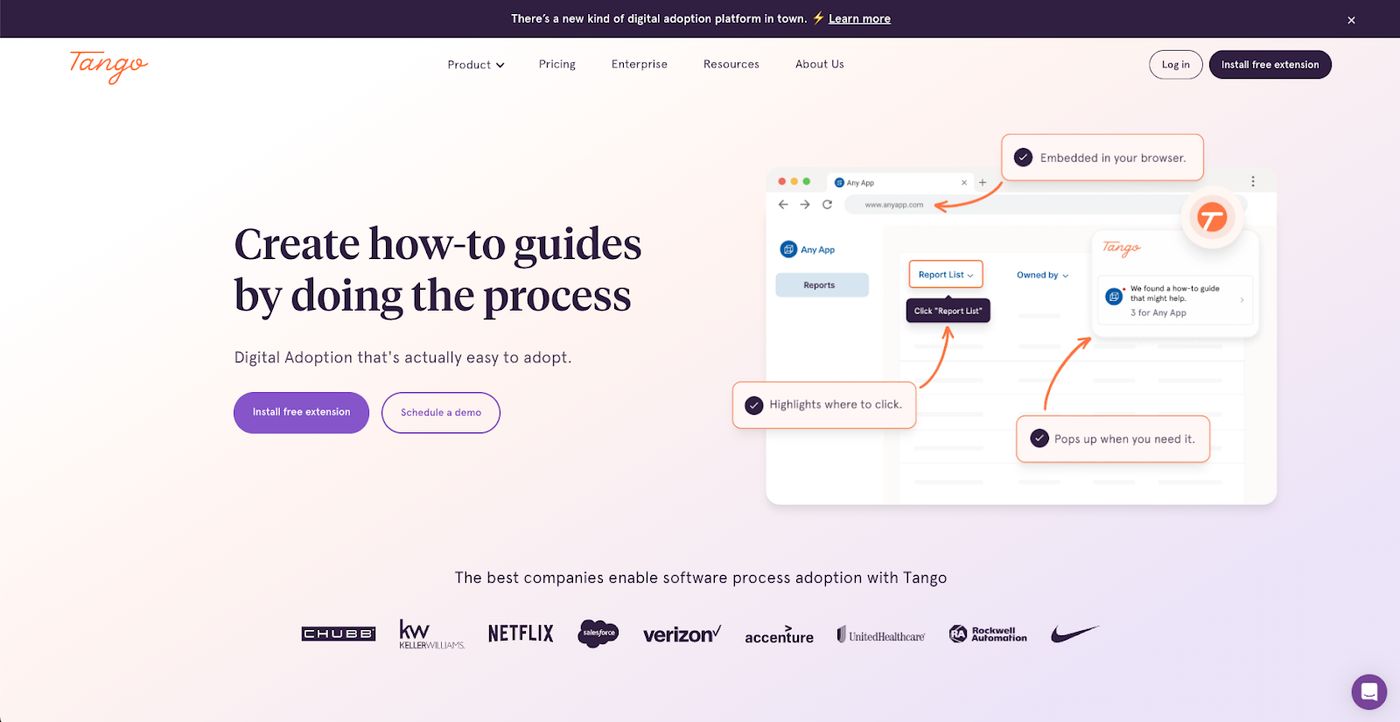 Tango is a popular web browser extension that can be used to automatically capture screenshots for training guides, workflows, and how to’s. The recorder automatically documents each step to produce interactive walkthroughs and guides for training, onboarding, and process documentation purposes. The biggest difference between Tango and the majority of other tools in this list is that Tango can be used to record guides/workflows across desktop, so it's not restricted to browser-based workflows.