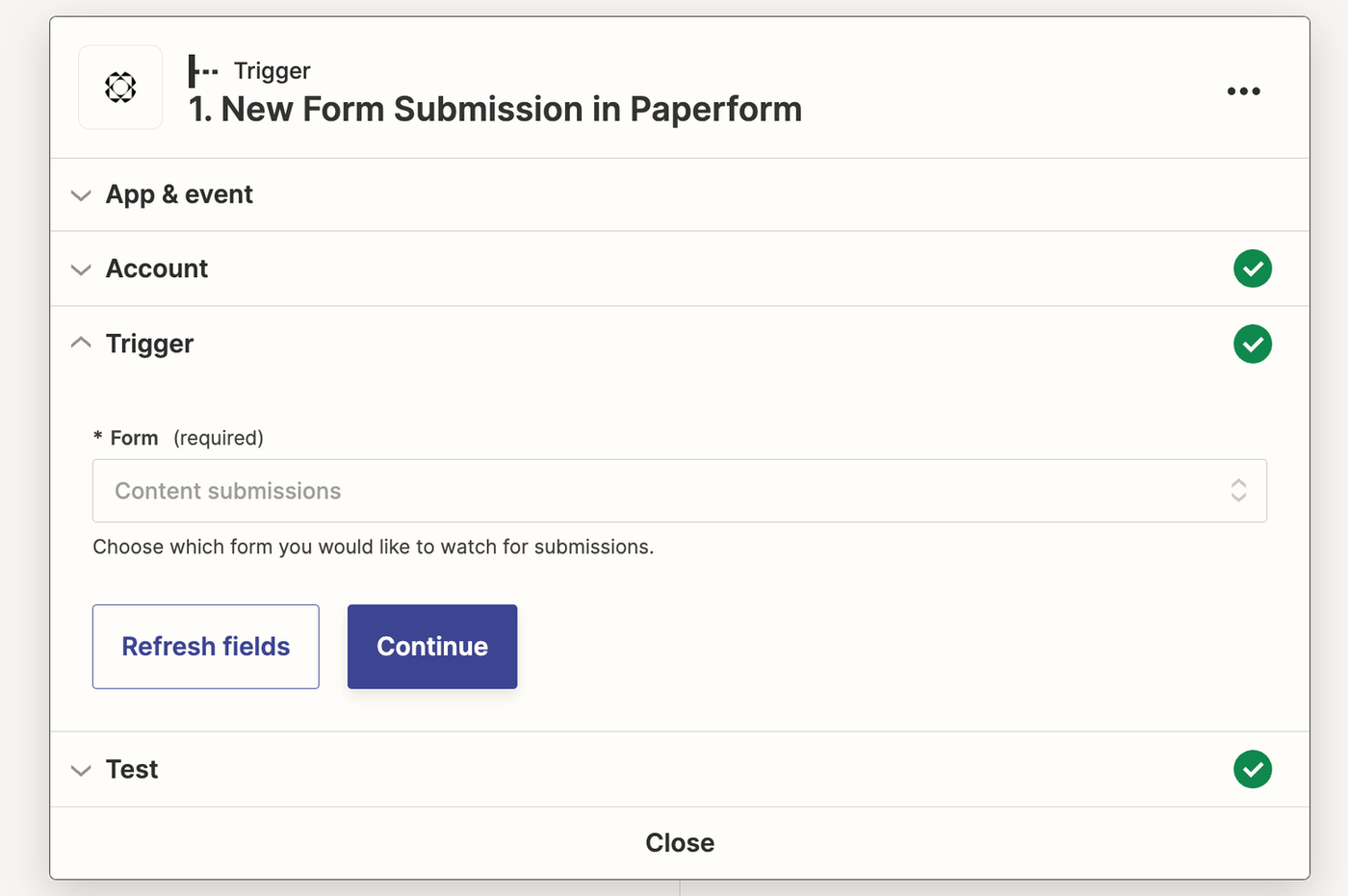 Once that's done, click the Zap template above and log in to Zapier. Connect your Paperform account, and choose the relevant form to act as your trigger.