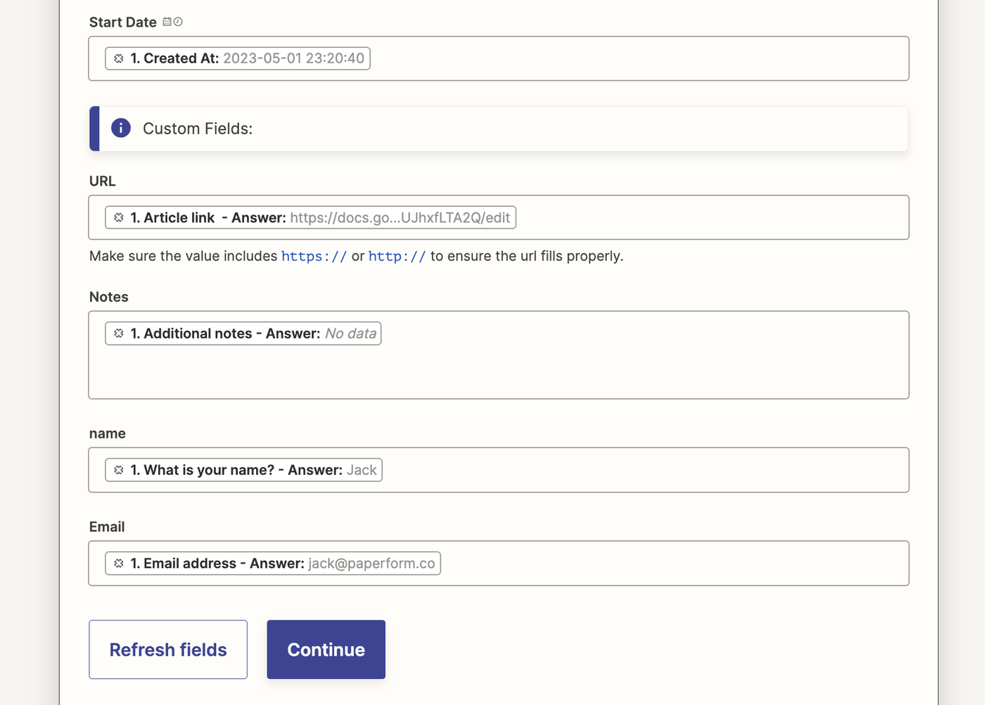 Next step is to connect your ClickUp workspace. Once the workspace is linked, it's time to map the individual Paperform fields to the relevant fields in ClickUp. Here it helps to make sure your fields share similar names, that way you can easily find the relevant Paperform answers to pipe to ClickUp.
