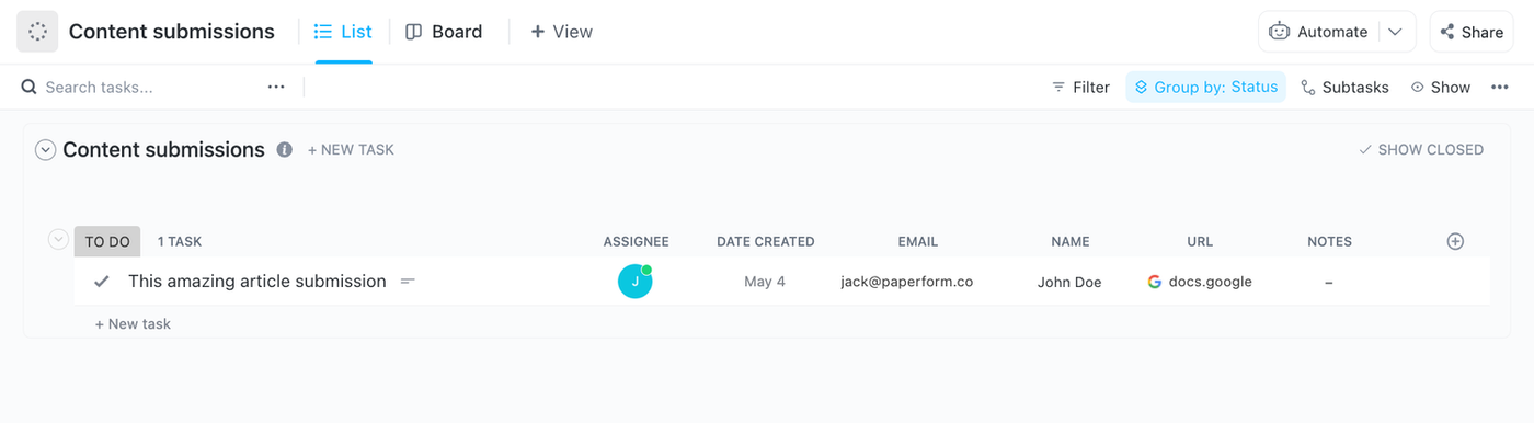 Once all the fields are mapped, just run one final test to check things are working, and you should be good to go! Our example Zap worked a treat, and now a ClickUp task is created any time our content submission form is filled out. We also set it so that these tasks are automatically added to a "to do" list and assigned an editor—pretty neat, right?