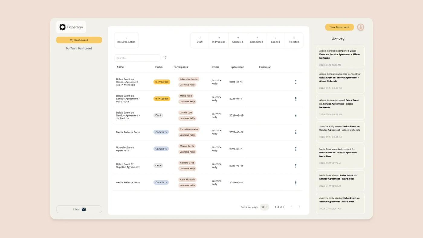 With our document designer, you can customize your documents so they’re a fitting and cohesive representation of your brand. You can monitor your document’s progress in real time with instant notifications or manage all of your documents at once from the intuitive dashboard.