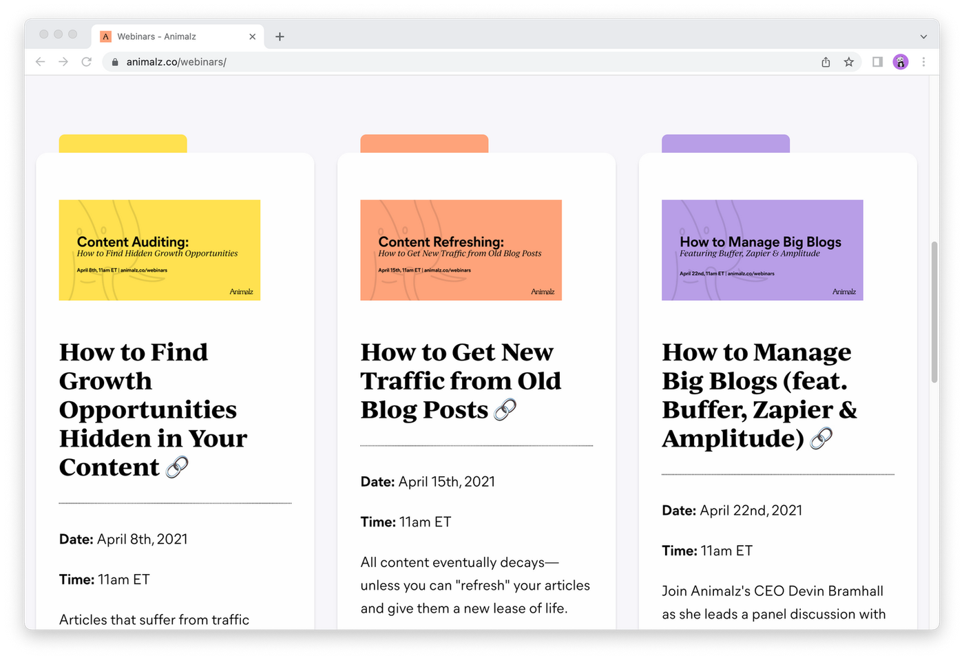 There’s no need to reinvent the wheel. SaaS content marketing agency Animalz managed to build an event landing page for their webinars that reflects their brand while keeping the design nice and basic.