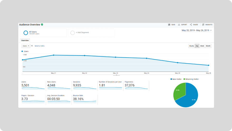 Your audience overview gives you comprehensive insights into who’s accessing your website. Click on it and you’ll see charts that represent the following data: