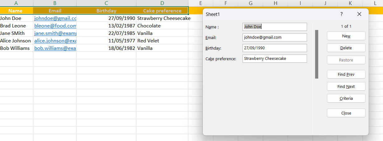 Your work is nearly over. All you need to do is select the header row of your sheet, click on the Form button, and fill in the fields. Click New to add a response to the spreadsheet.