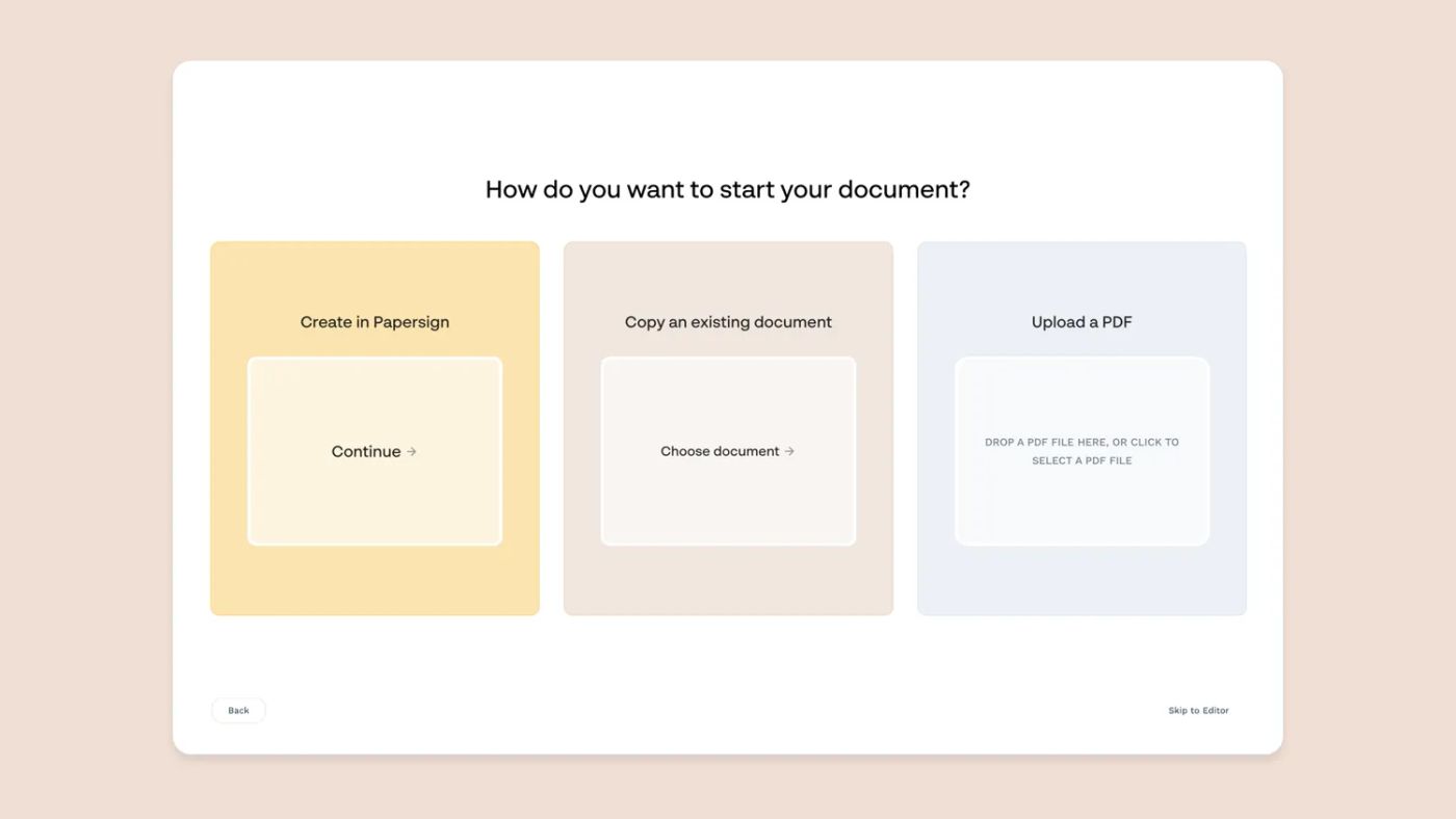 If you haven't already, create an account at Papersign.co (it's free to get started). From the dashboard, click New Document and choose Create in Papersign.