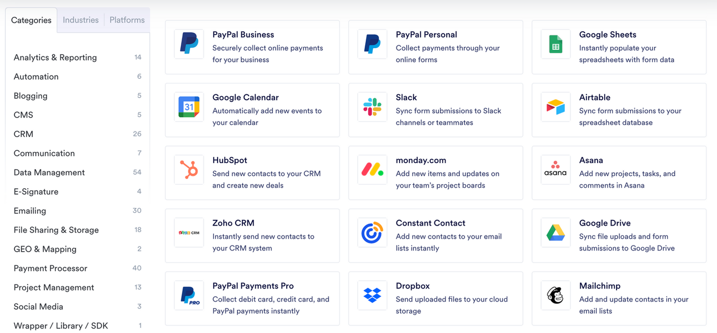 Jotform, on the other hand, supports over 100 direct integrations and thousands more via Zapier or Make. You can connect your form with Asana to automatically create tasks based on form submissions, or use a payment integration to process cash through your Jotforms.