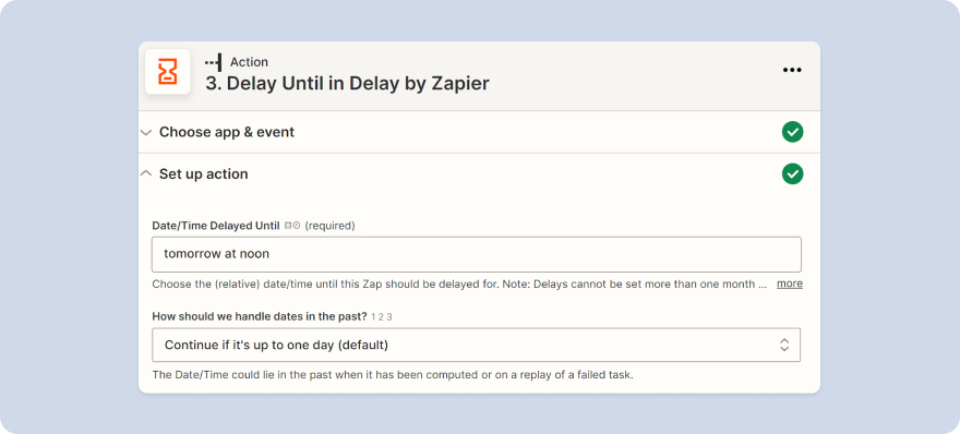 This is made easy in Zapier. You can choose the Delay by Zapier function, which gives you three options: