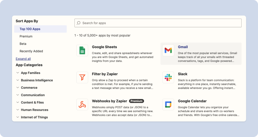 All you need to do is type the name of your preferred app in Zapier's search box to see if it's listed.