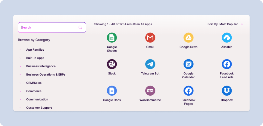 Connect with over 2,000 popular apps and software to improve productivity and automate workflows
