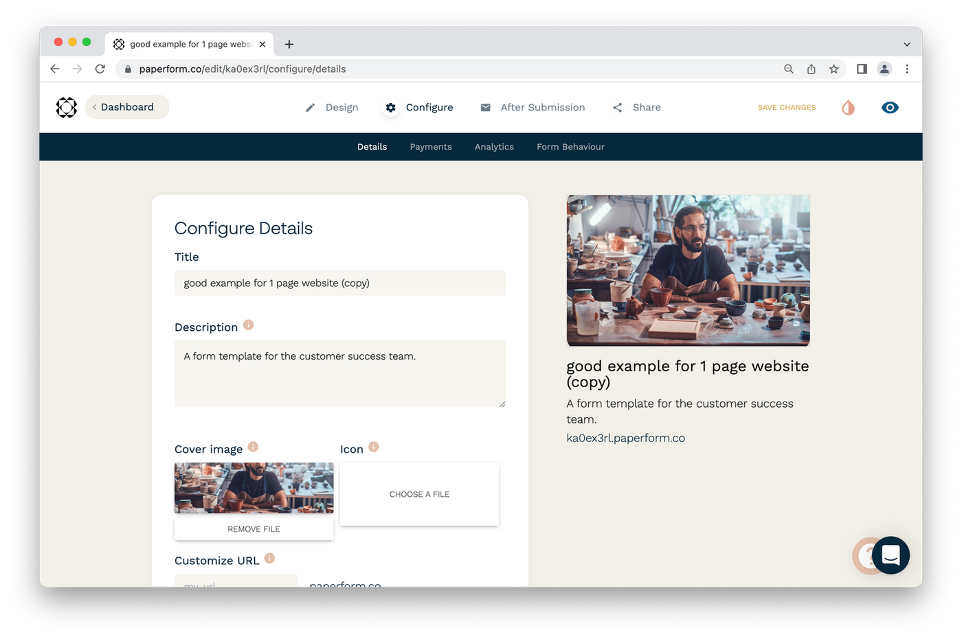 There's just one last step. Head to the Configure tab to adjust how your site will look when people share your link. Add a title, a description and a cover image - and don't forget to customize the URL to your liking.