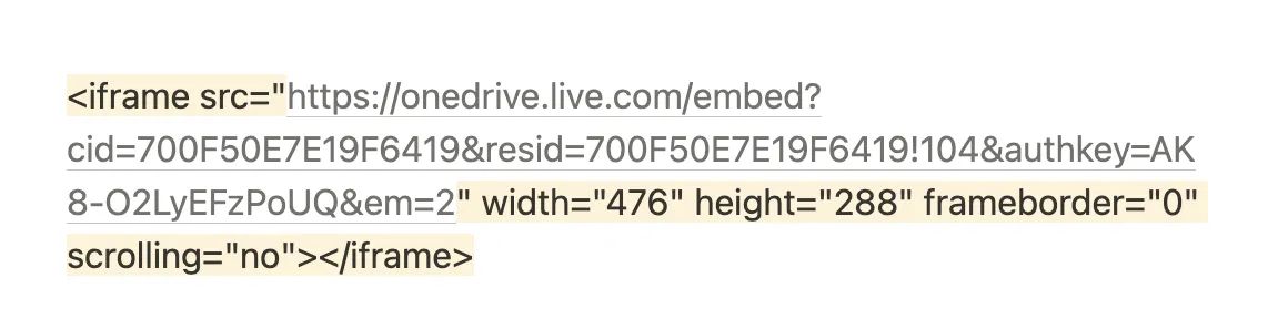 Copy the embed code from the provided menu (Source: OneDrive)Copy the code and paste it somewhere that you can edit the text—a note, or a document is fine. For this tutorial, we've used Notion. First, erase the iframe code, which is highlighted below.