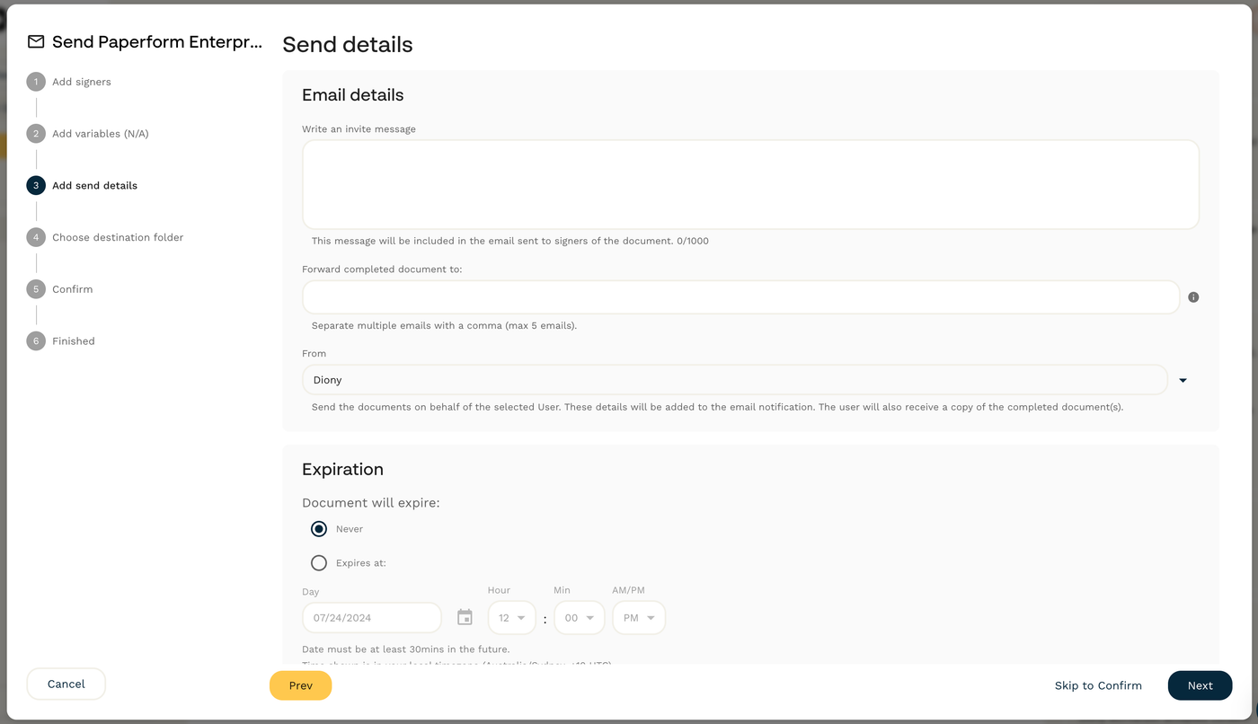 Email config added to integration - map values into the custom invite message and additional recipients in the Paperform integration