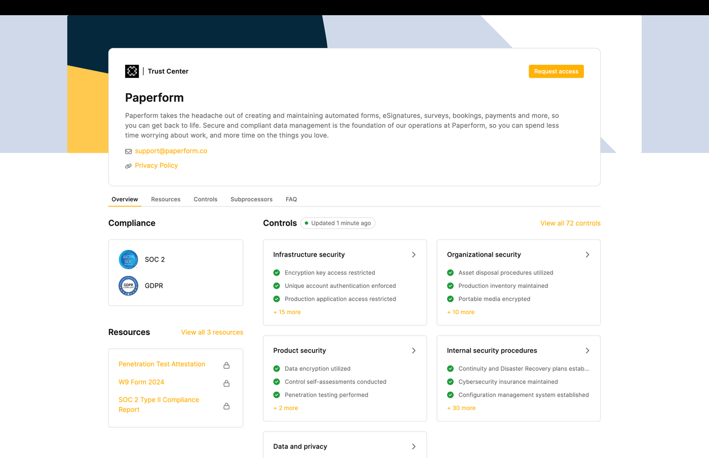 We recently launched Paperform's Trust Center, a centralized hub designed to show you which security measures we have in place and enable you to self-serve the security documentation and other information needed for things like vendor reviews and DPAs.