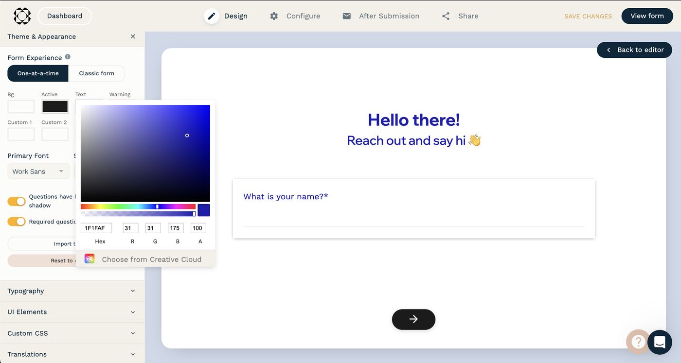All the rich theming functionality you know and love, but now with a live preview of the theme as it’s applied to your form! See your brand take shape dynamically on your forms, and move faster with better creative decision making, especially for features like Custom CSS.