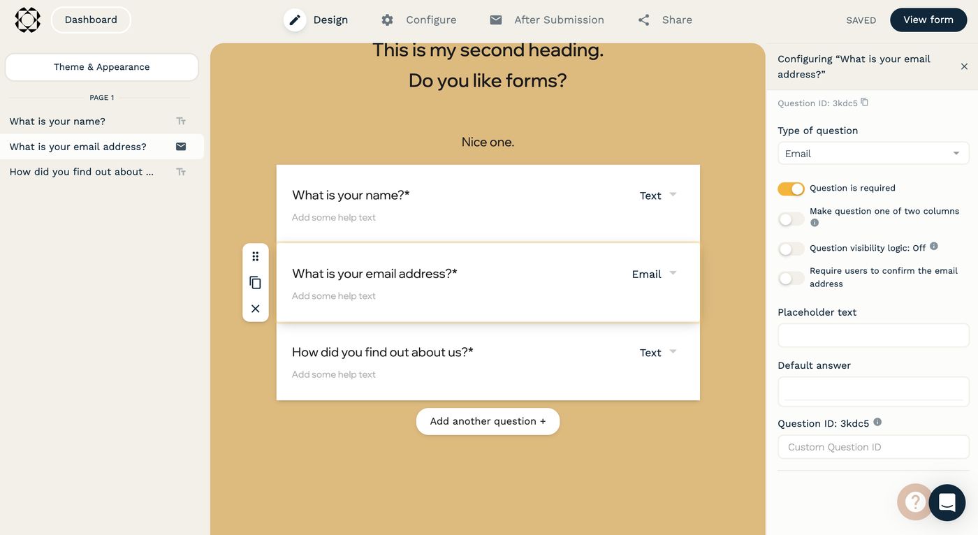Forms are now centred in the middle of the page with columns on either side, and we’ve moved editing functionality into these sidebars to reduce the effort to create and make changes. It also means you can see your changes on the form while you edit. While we love the aesthetic simplicity of having the editor take up the full page, there was a whole lot of space available to use for improving the experience.