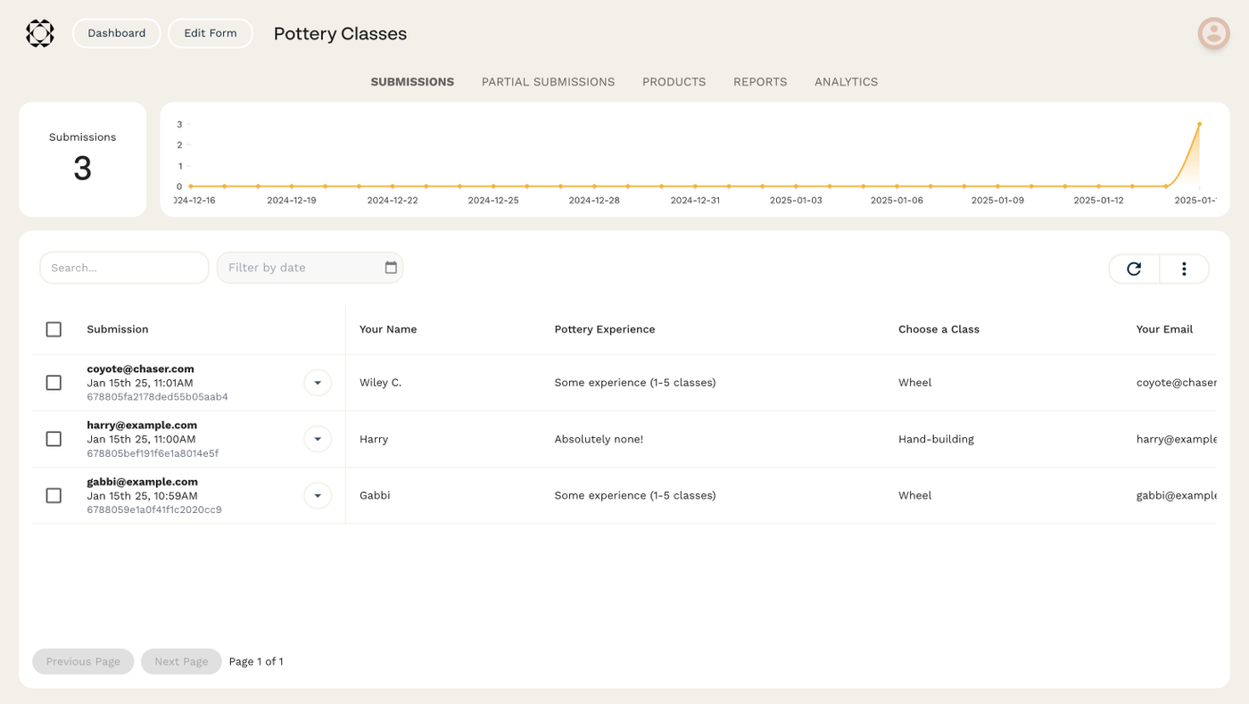 We've brought you a new UI with an "inbox" feel, with tabs to access different pages (partial submissions, products, reports and analytics), filters to view specific question responses or search by keyword and date, and visuals to help you gauge your submission count over the last month.