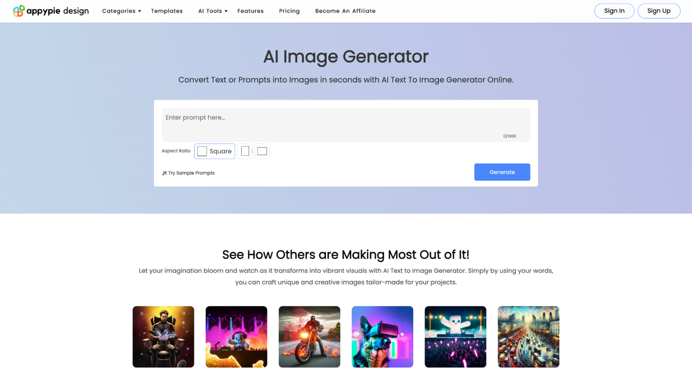 Unlike traditional design tools, Appy Pie Design's AI image generator leverages advanced algorithms to understand and interpret text prompts, offering a seamless bridge between your imagination and visual content. This innovative approach allows for unique, compelling images tailored to your specifications, opening up possibilities for digital art, marketing materials, website content, and more.