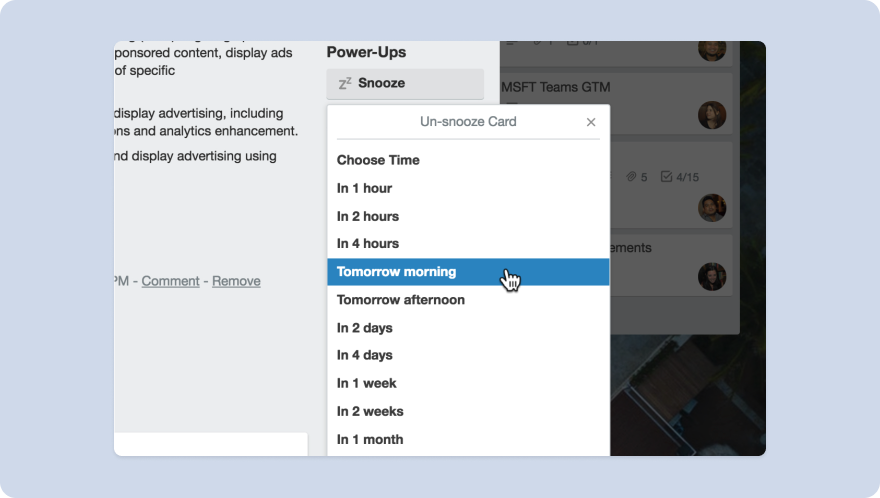That's where the Card Snooze Power-Up comes in. It helps you clean up the clutter of cards until you're ready to deal with them.