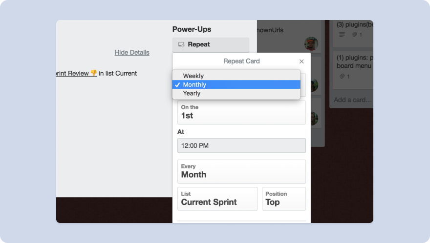 Card Repeater manages at least some of these routine tasks for you. It automates the creation of Trello cards for repeated tasks, scheduling a replica of the master card on any time and date you set.