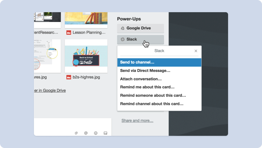The Slack Power-Up for Trello allows you can turn chats into tasks so no idea ever slips through the cracks. You can send cards to channels or direct messages, and attach Slack conversations to your cards for additional context.