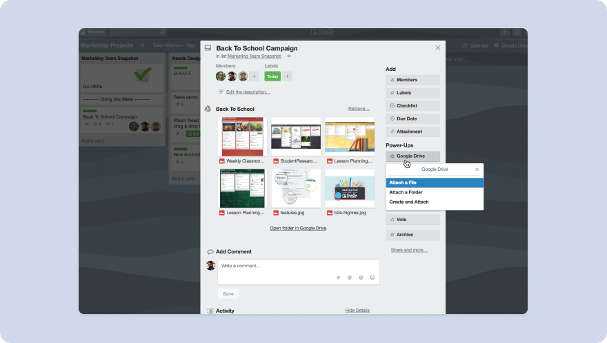 Whether you're using Trello for onboarding new employees, managing an editorial calendar, or tracking freelance projects, the Google Drive Power-Up is a must-have for almost any Trello user.