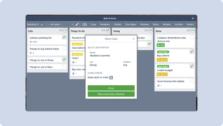 Just click the Bulk Actions button at the top of your board to change or shift due dates, modify custom fields, re-name, move and relabel cards, or add comments and attachments—across multiple cards.