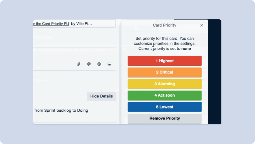 With this Power-Up activated, you can attribute priorities to your cards to properly manage your work. You can set five colour-coded priorities, and make them appear on the front of card for better visibility.