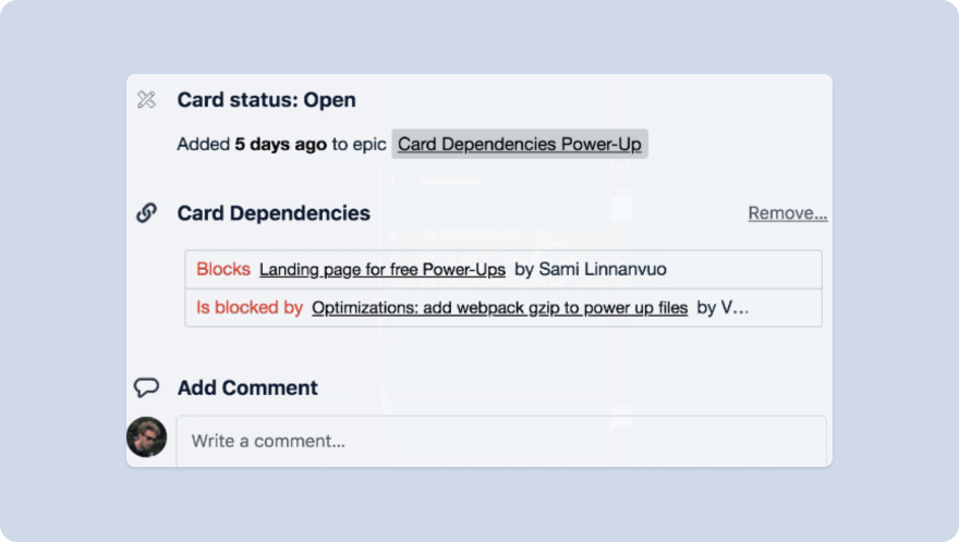This can be to specify which task is currently blocking another, or to create parent-child relationships between cards.
