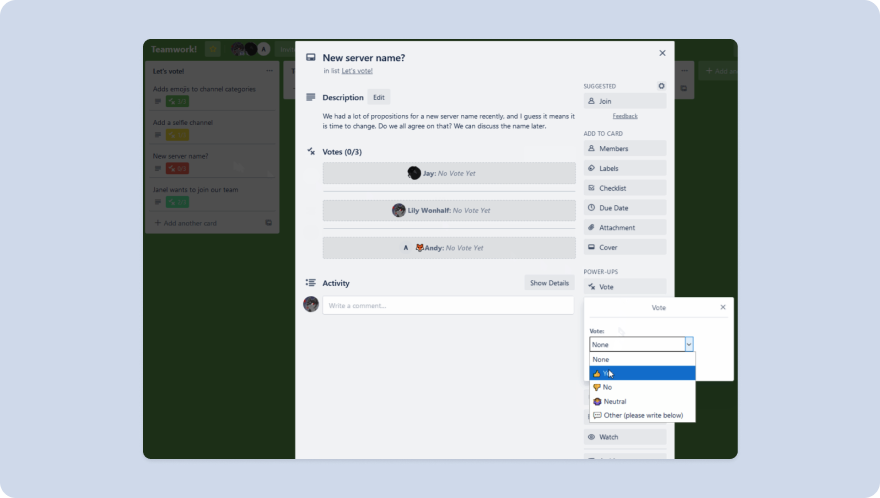Advanced Voting simplifies communication by bringing voting to Trello. Just click on a card, click the "Vote" Power-Up, and choose the option that best matches your opinion.