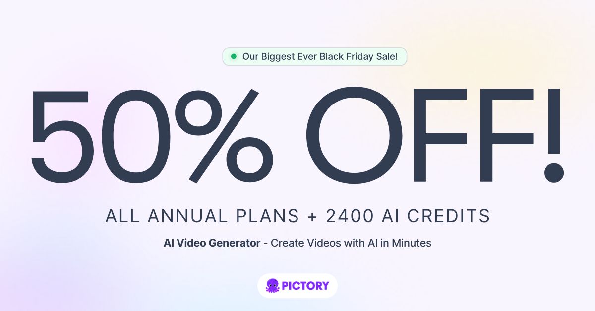 | Pictory | 50% off + 2400 AI Credits | Nov 10 - Dec 4 | Get Deal |