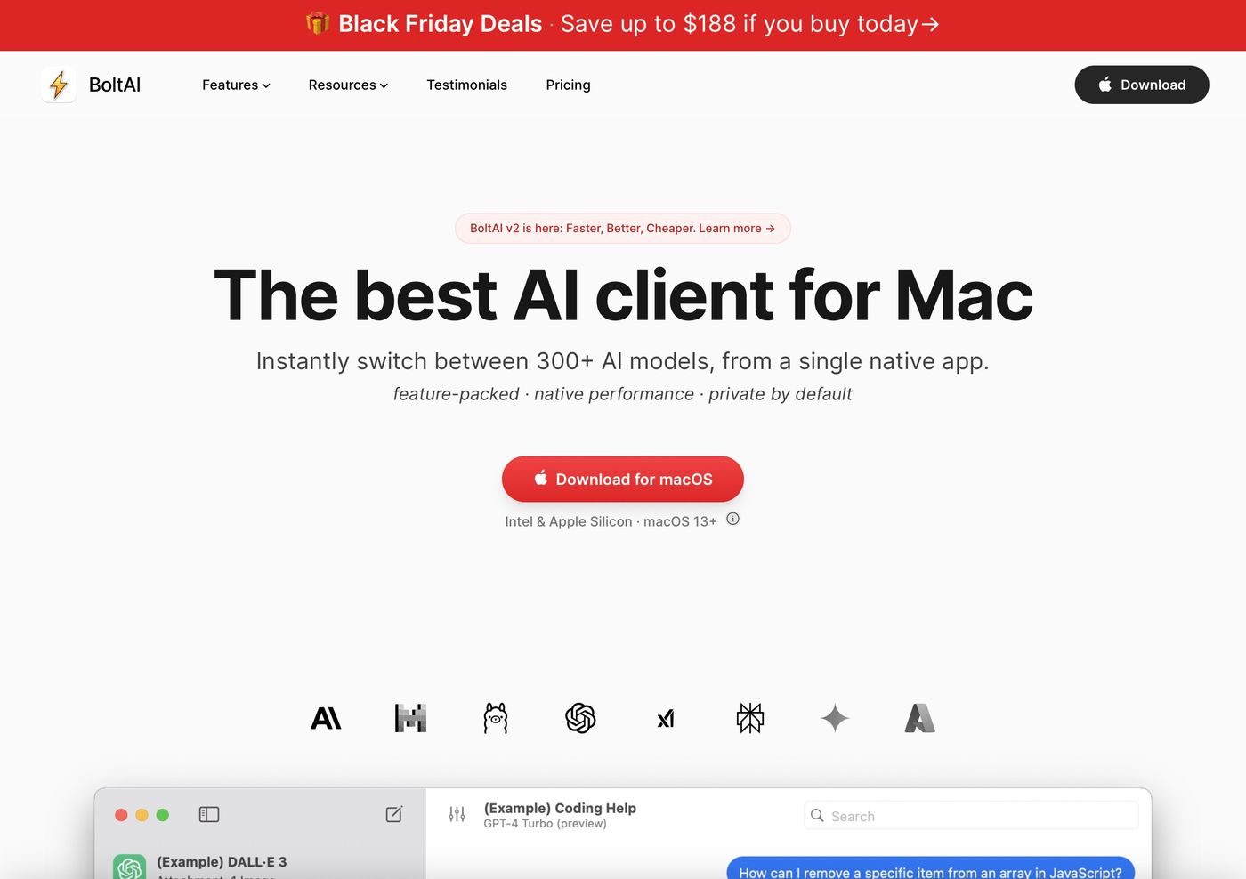 BoltAI is perfect for Mac users who need quick access to multiple AI models for various tasks, from writing to coding to analysis.