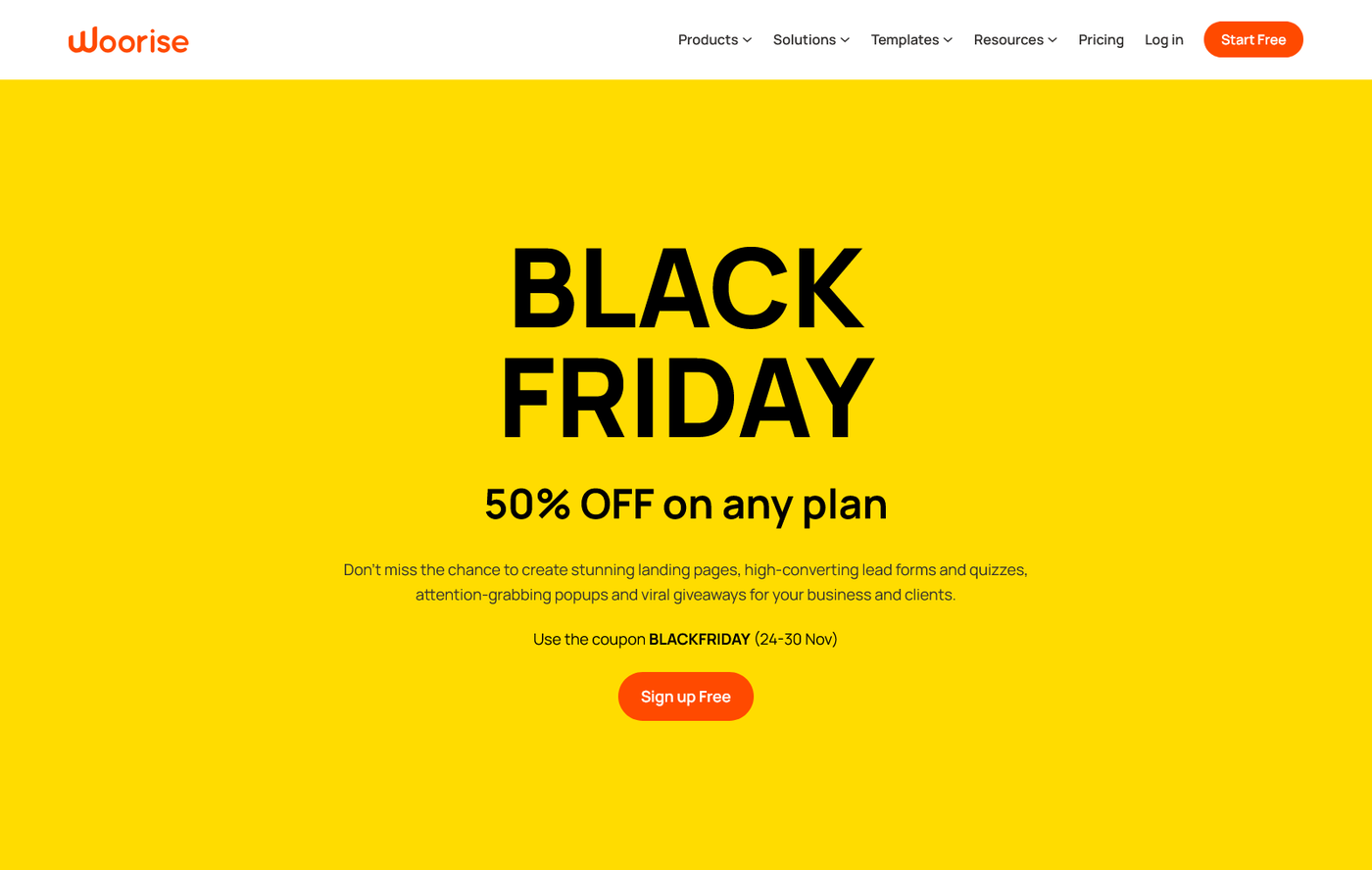 | Woorise | 50% off with code BLACKFRDAY | Nov 24 - Nov 30 | Get Deal |