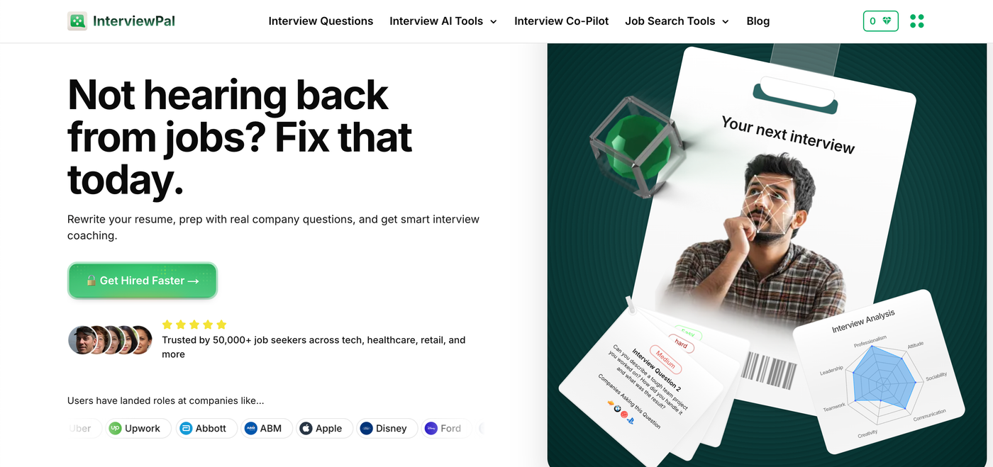 InterviewPal helps you find real interview questions asked by recruiters in the last 90 days, fix your resume to pass ATS bots, and prepare for every stage of your job hunt, all in one place.