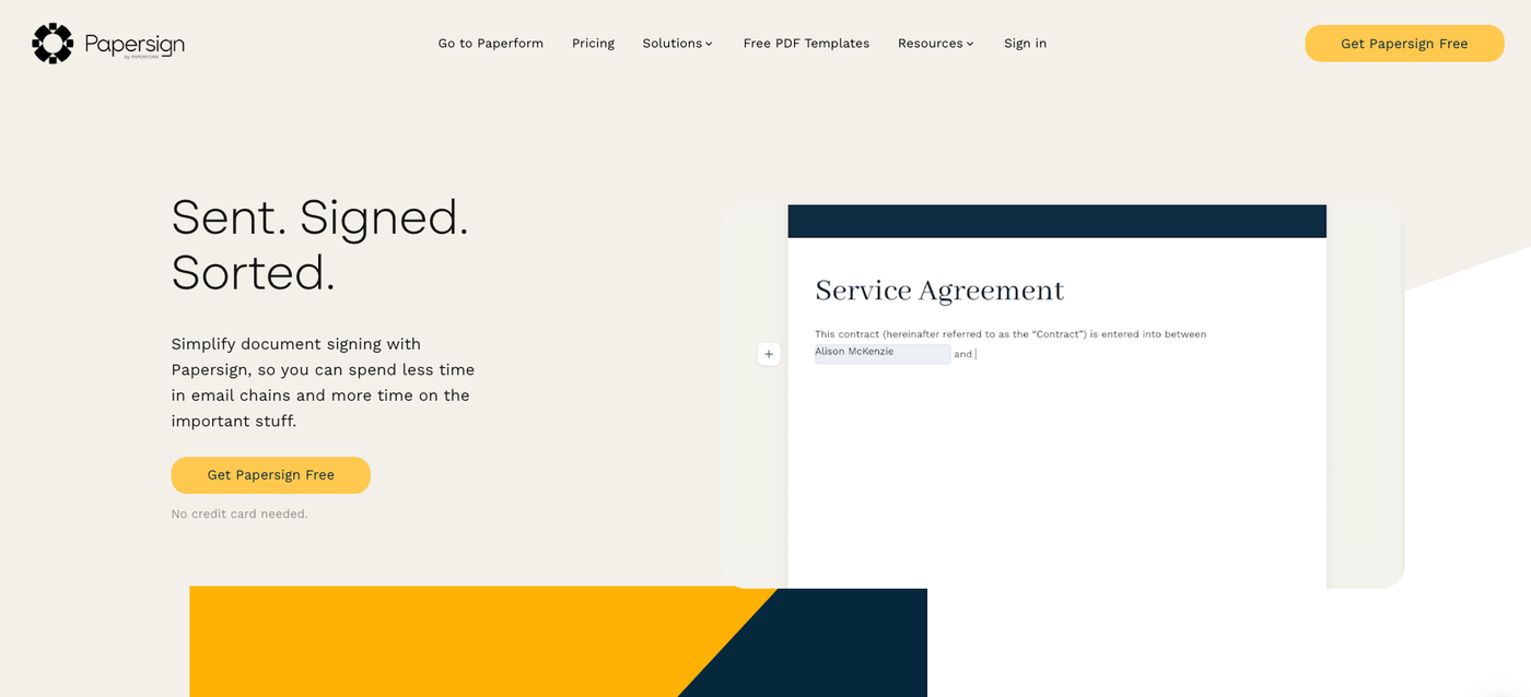Second on the list Papersign - Papersign, is a cost effective and simple way to send and sign documents with customers, clients and contractors. Easily streamline document signing processes, and make it simple to collect legally binding eSignatures on critical documents, from contracts to NDAs.