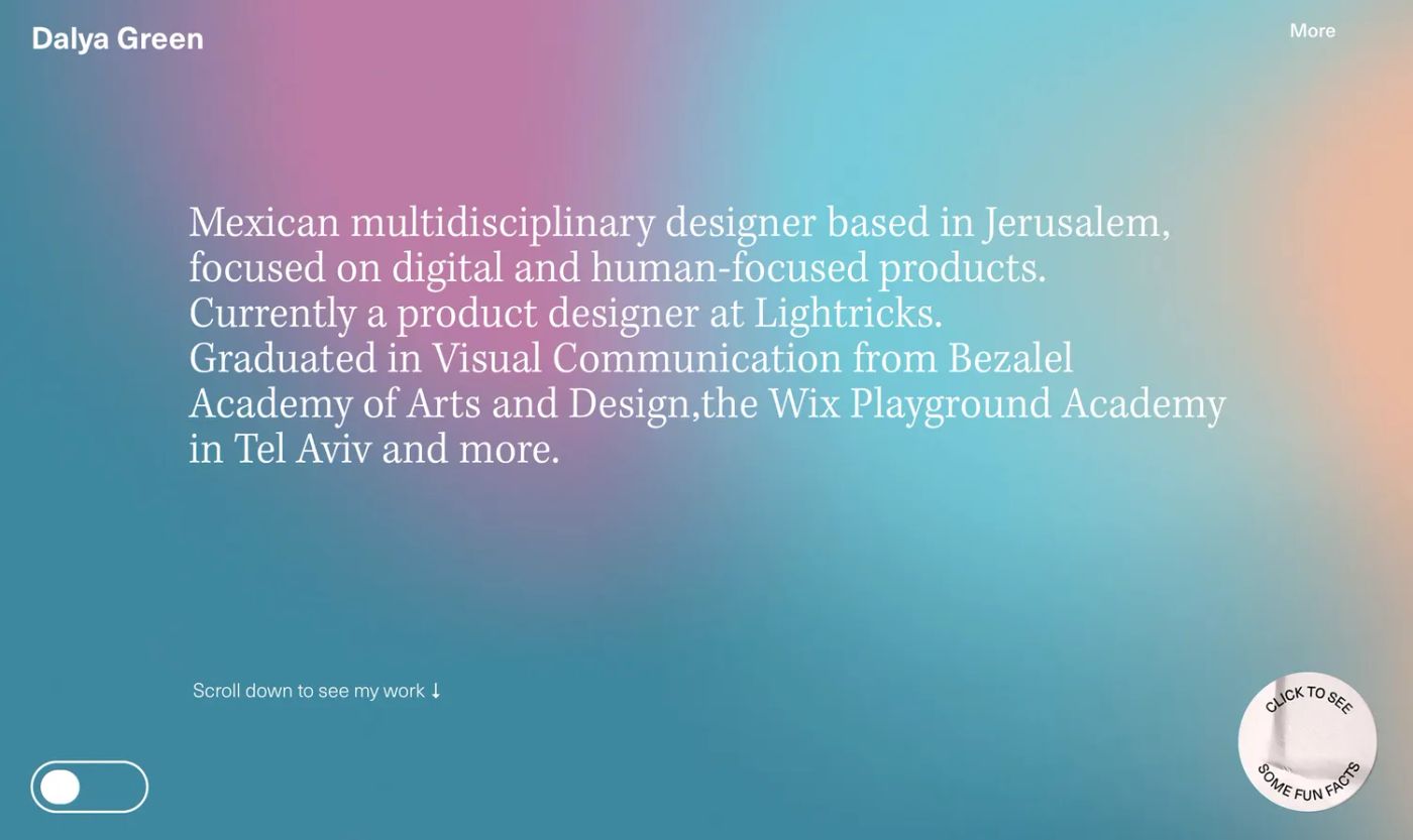 Daly Green's portfolio is a striking one-page showcase that blends professional finesse with personal flair. It stands out with its interactive elements—a gradient background that visitors can personalize; a clickable button inviting visitors to discover fun facts about Dalya.
