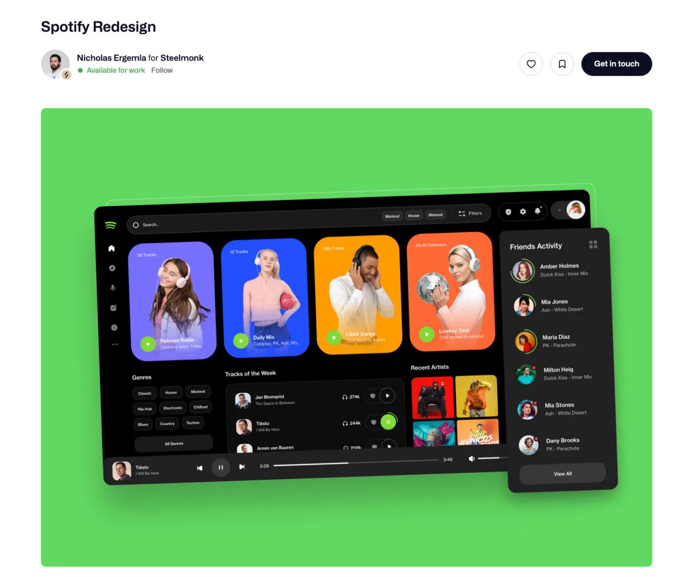 Spotify redesign via Nicholas Ergemla (Dribbble)An unsolicited redesign is when a UX designer chooses to redesign an existing app or website without being asked or paid to. They're great to include in your portfolio for a multitude of reasons.