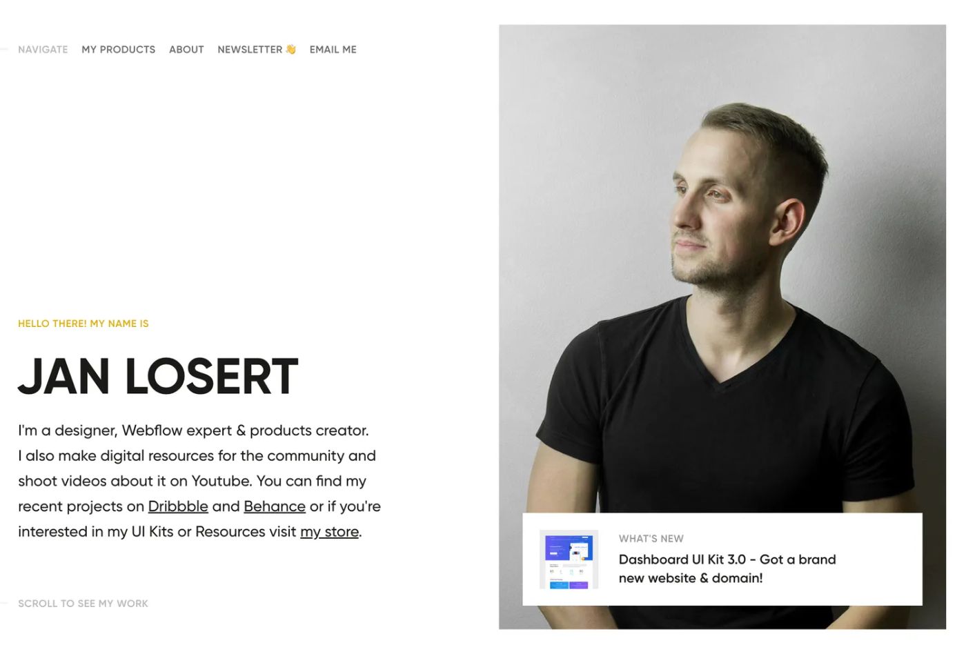 Jan Losert's website serves as a comprehensive portfolio of his work and expertise in product design and Webflow, offering resources and insights for both aspiring and experienced designers and developers.
