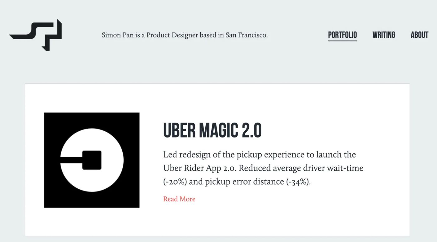 Simon Pan's site is clean and effective. His portfolio shows a wealth of experience in product design and user experience, highlighting his impact on notable projects for Uber, Amazon Prime, and more, each demonstrating his skills in UX design.