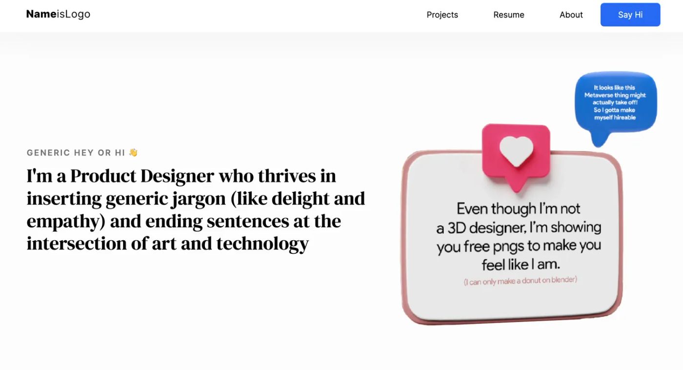This website presents a unique and humorous take on a UX designer's portfolio. It is filled with self-deprecating humor and tongue-in-cheek commentary to highlight and critique common experiences in the UX design field. Join the trend or use it as a base for what to avoid—the choice is yours!